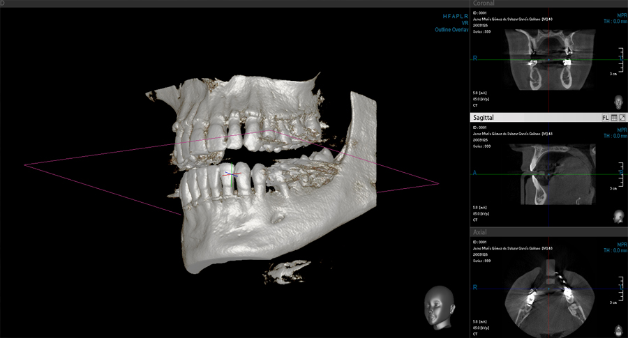 La radiografía 3D, también conocida como tomografía computarizada de haz cónico (CBCT), es una técnica de imagen que genera una vista tridimensional completa de la boca del paciente.